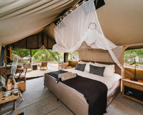 Die Gäste wohnen in handgefertigten, rustikalen Zelten, die einfach, aber komfortabel ausgestattet sind. Jedes Zelt verfügt über Feldbetten, ein Waschbecken, einen Spiegel sowie eine private Eimerdusche unter freiem Himmel, die mit warmem Wasser beheizt wird. Ergänzt wird dies durch eine einfache Buschtoilette im Zelt sowie zusätzliche gemeinschaftliche Sanitäranlagen mit Wasserspülung im Camp. Das Camp verzichtet bewusst auf Strom in den Zelten und schafft so eine authentische, ruhige Atmosphäre fernab moderner Ablenkungen. Elektronische Geräte können im Safarifahrzeug geladen werden. Die Ausstattung ist funktional und konzentriert sich auf das Wesentliche, ohne auf grundlegenden Komfort zu verzichten. Als mobiles Camp wird es an ausgewählten Standorten innerhalb des Parks aufgebaut und während der Safari beibehalten, wodurch eine angenehme Beständigkeit entsteht. Gleichzeitig bleibt das Erlebnis exklusiv, da das Camp nur für eine kleine Gästeanzahl ausgelegt ist. Insgesamt richtet sich die Inzila Mobile Safari an Reisende, die eine authentische, persönliche und bewusste Unterkunft suchen, bei der Nähe zur Natur und ein ursprüngliches Safari-Gefühl im Mittelpunkt stehen.